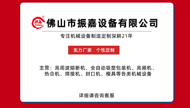 佛山市振嘉機(jī)械設(shè)備有限公司專業(yè)生產(chǎn)高周波機(jī)器,擁有自動(dòng)化設(shè)備技術(shù) 21 年。我們是一家集研發(fā)、生產(chǎn)、銷售與售后為一體的生產(chǎn)廠家