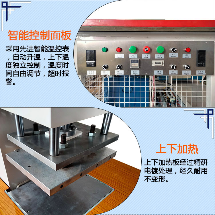 6、上下模具獨(dú)立加溫功能,自動(dòng)恒溫,溫度誤差正負(fù)1度(采用平板式安裝模具方式,模具只需要安裝固定在平板上即可,簡單方便)
