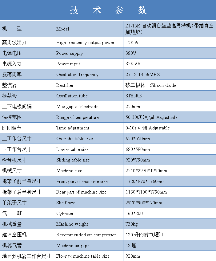 機(jī) 型:ZJ-15K自動(dòng)滑臺坐墊高周波機(jī)(帶抽真空加熱爐)