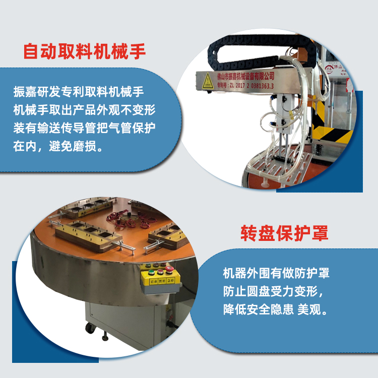 振嘉牌四工位全自動(dòng)單機(jī)械手吸塑封口機(jī),以自動(dòng)轉(zhuǎn)盤方式操作,操控簡單易懂,便于維護(hù)及保養(yǎng),此機(jī)為圓盤360度旋轉(zhuǎn),分為四個(gè)工作位,即每90度為一個(gè)工作位,圓盤轉(zhuǎn)盤裝有數(shù)字化變頻器來帶動(dòng)電機(jī),變頻器控制圓盤轉(zhuǎn)盤速度,變頻器調(diào)速的好處是方便調(diào)節(jié)電機(jī),數(shù)字化顯示可調(diào)節(jié),簡單易懂,高效節(jié)能,本機(jī)配有PLC觸摸屏控制。